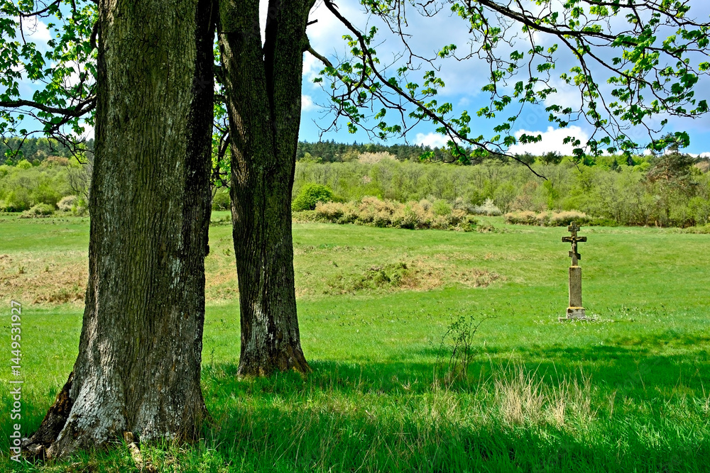 Wayside old stone cross in Nieznajowa village, Low Beskids, Poland.