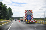 Roadwork arrow sign on back of the work truck. Orange traffic cones and unrecognizable cars driving on the road. Waikato. New Zealand.