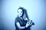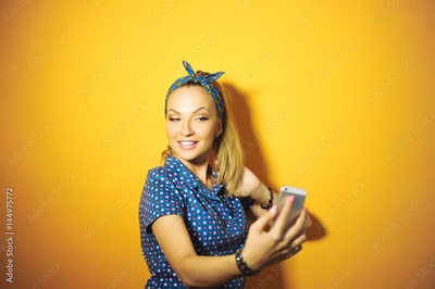 close-up portrait of a beautiful girl in the studio Young sexy hipster stylish bright on a yellow background with pink lips and manicured with a phone does selfi