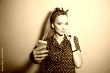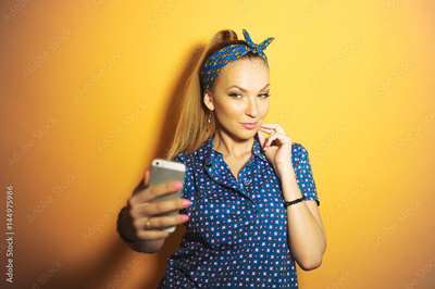 close-up portrait of a beautiful girl in the studio Young sexy hipster stylish bright on a yellow background with pink lips and manicured with a phone does selfi