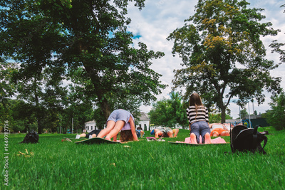 Group of Young People Performing Yoga on Green Lawn Under the Shade of Trees in Summer