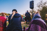 People wrapped in blankets enjoying a live music performance outdoors. Cozy picnic atmosphere during a cool evening concert in the park or garden.