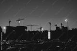 The Serene Silhouette A Nighttime View of Construction Cranes Against the Dark Blue Sky At Twilight