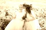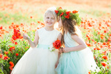 little girl model, childhood, fashion, summer concept - beautiful smiling girlfriends talking in a field of poppies, they gather poppy, elegant white and blue dresses and wreaths on the heads