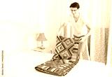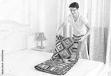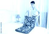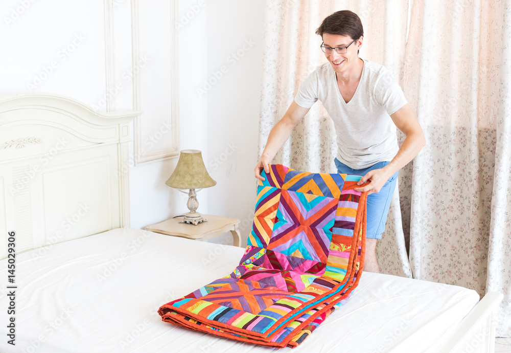 handsome smiling young man folds double a color patchwork quilt on big bed in the white interior. scrappy blanket on the bed closeup. Handmade.