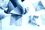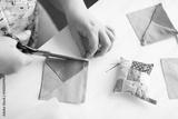 patchwork and quilting in the workshop of tailor woman - close-up on tailor scissors cuts the thread on the blue and yellow scraps of fabric for patchwork on the desktop with thread, pins and cushion