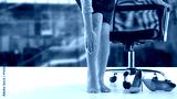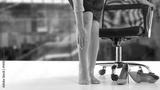 Tired female feet in high heels - woman sitting on a chair in an office and massaging feet after long day at work.
