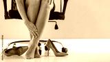 Tired female feet in high heels - woman sitting on a chair in an office and massaging feet after long day at work.