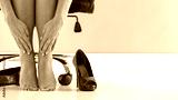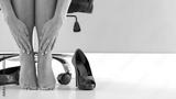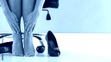 Tired female feet in high heels - woman sitting on a chair in an office and massaging feet after long day at work.