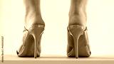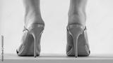 Female feet in high heels on pedestal - footwear and fashion concept.