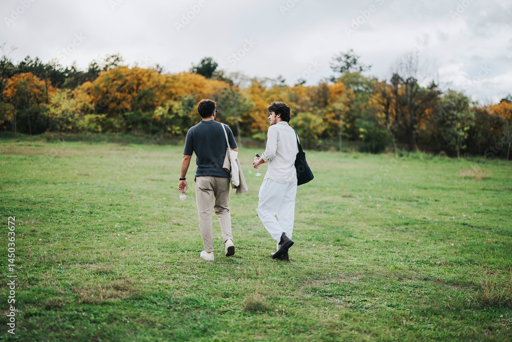 Two friends stroll across a green field, each holding a wine glass. The autumn foliage creates a warm, inviting backdrop, suggesting relaxation and companionship.