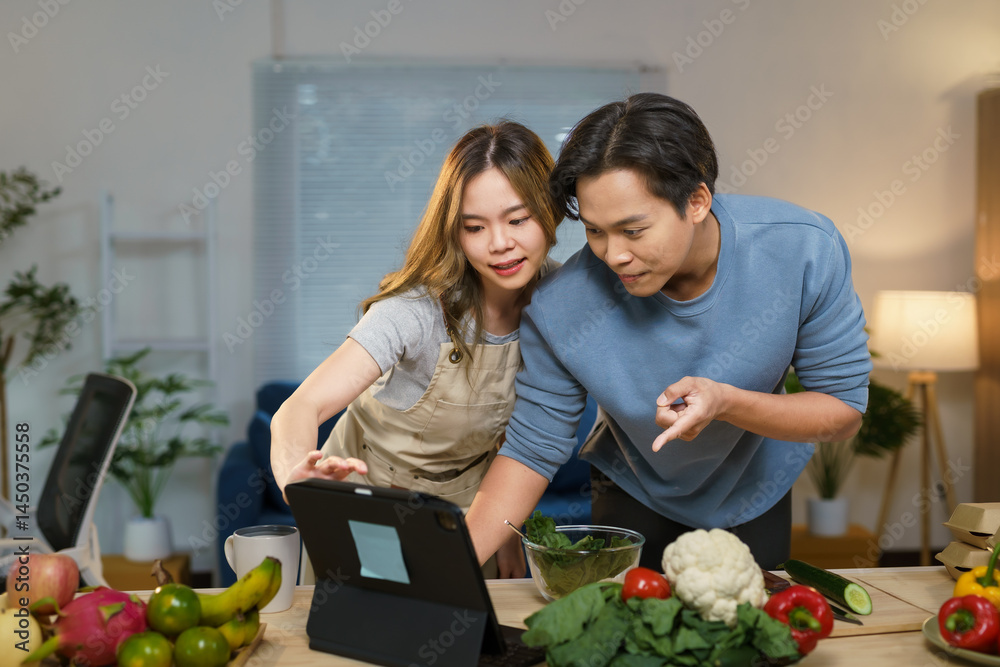 Young asian couple following online recipe on tablet while preparing healthy meal with fresh vegetables in kitchen at home