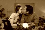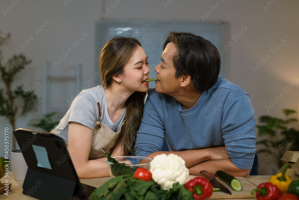 Asian couple having fun sharing a vegetable while preparing a healthy meal by following online recipe on a digital tablet