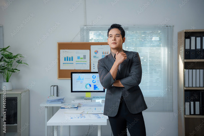 Young manager standing in his office with arms crossed, looking away and thinking, with graphs and charts on the computer screen and corkboard