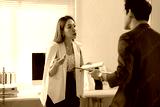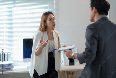 Asian businesspeople collaborating and exchanging ideas while reviewing documents in a contemporary office environment, fostering teamwork and innovation