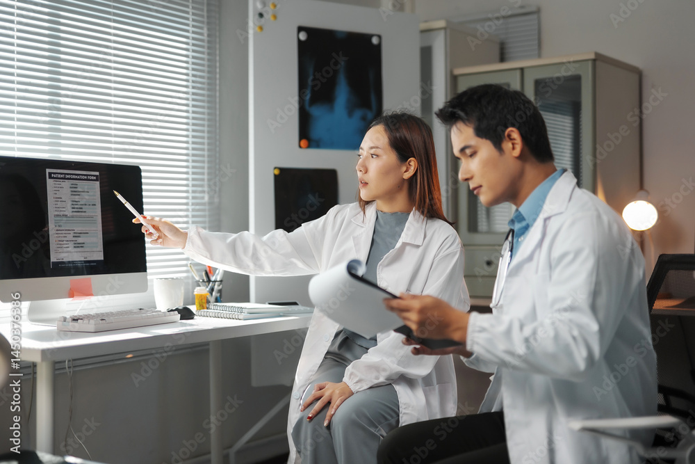 Two doctors examining patient information on computer and discussing diagnosis in hospital room