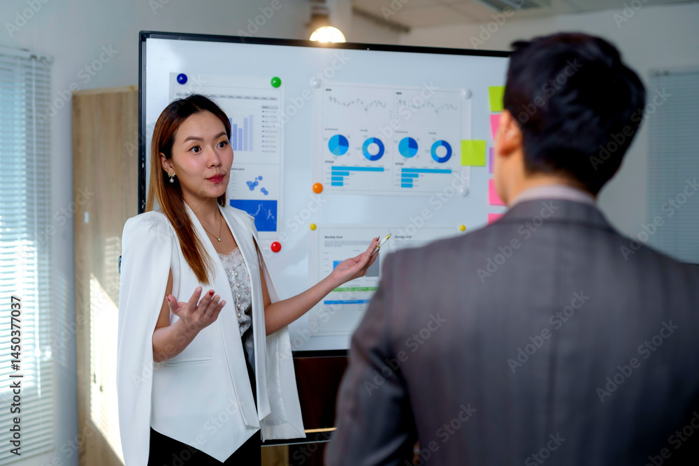 Businesswoman presenting marketing data on a whiteboard during an office meeting with a businessman, focusing on strategy and analysis