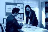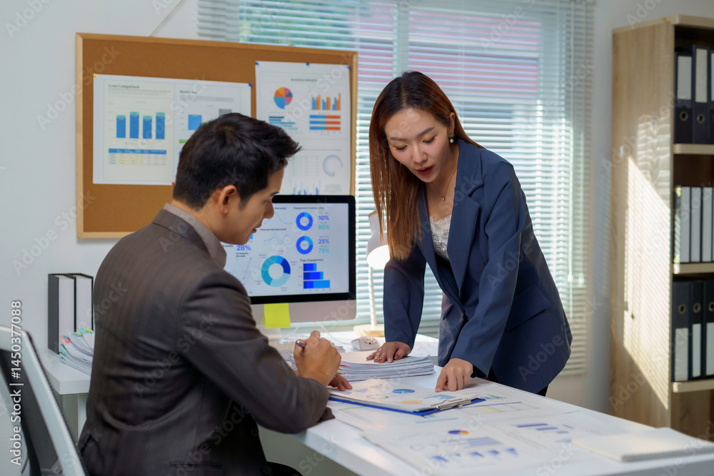 Asian businesspeople analyzing financial charts and graphs, discussing company strategy and working together in office