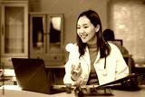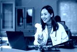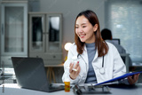 Smiling Asian female doctor holding medicine bottle and medical record having video conference with patient on laptop in hospital
