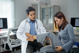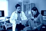 Doctor examining an injured leg of a young female patient in a medical office, highlighting healthcare and treatment concepts