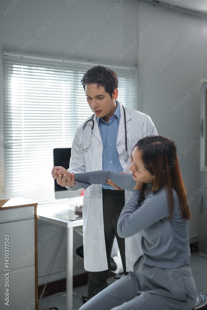 Doctor examining patient's arm in medical office, providing healthcare and checking for potential injuries or medical conditions