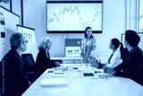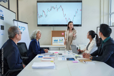 Business team discussing financial charts and graphs showing market growth during corporate meeting in conference room