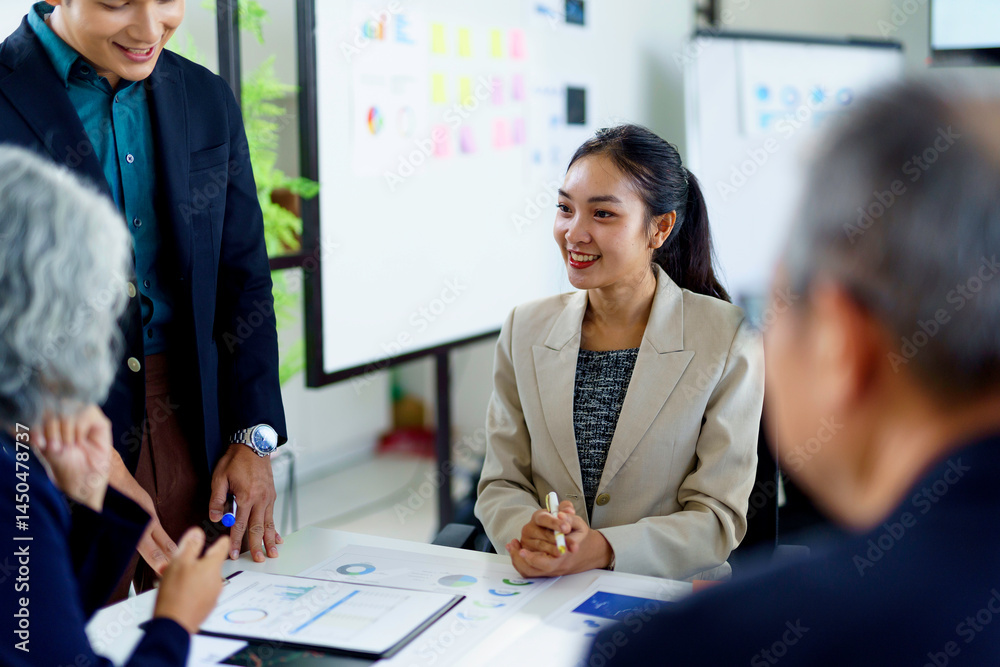 Asian businesspeople collaborating and brainstorming during a dynamic meeting in the office, focusing on strategy and innovative ideas