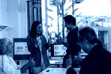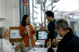 Asian businesspeople celebrating success with thumbs up during a lively meeting in a modern office, showcasing teamwork and achievement