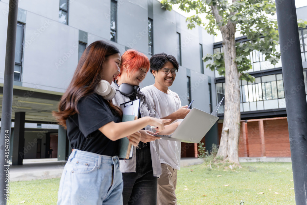 Group of asian students collaborating on a project using laptop and smartphone in university campus
