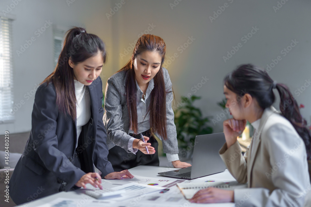 Asian businesswomen working together discussing and analyzing financial charts and graphs using calculator and laptop during a meeting in the office
