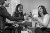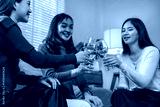 Group of young women enjoying a celebratory toast with white wine, symbolizing friendship, togetherness, and joyful moments