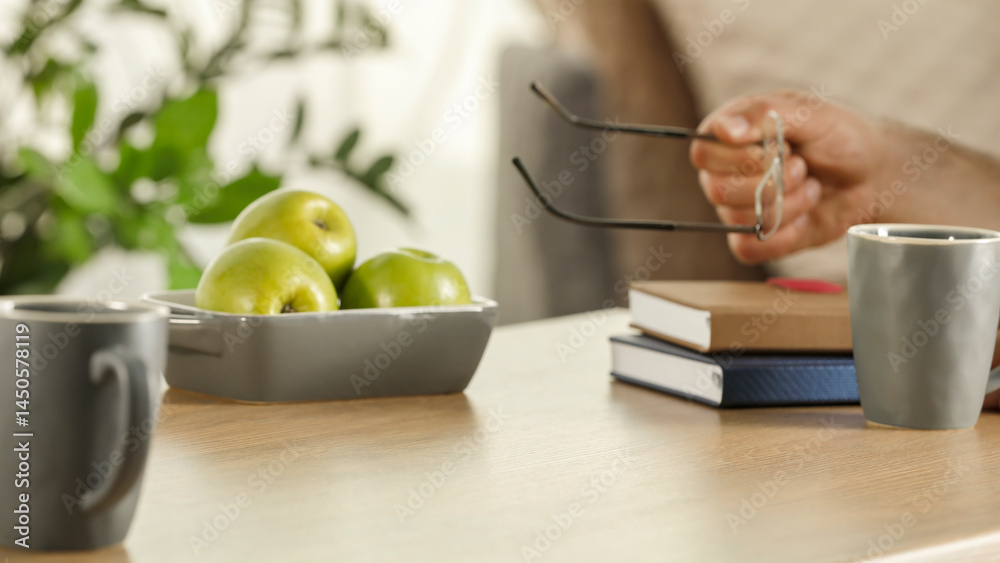 Close-up of table top with books and glasses and copy space for advertised product. Mugs, apple fruit, notebooks and hand holding glasses on the table. Working at home concept.
