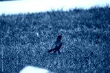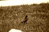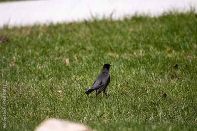 A common grackle foraging in the grass