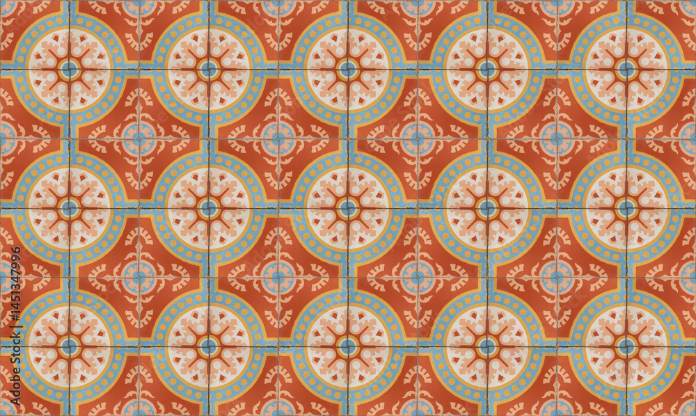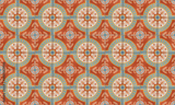 Decorative Mexican floor tile pattern, orange, blue, aqua, yellow, white, cream