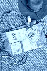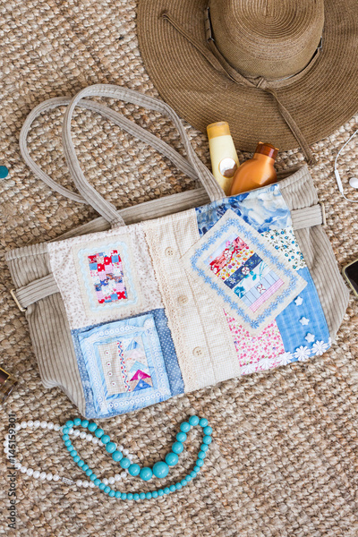 set for a summer outdoor weekend trip. Vacation background with beach accessories, top view, flat lay.
