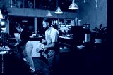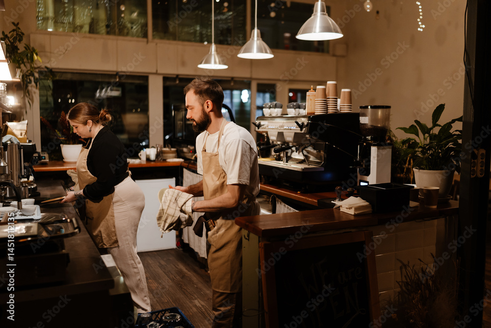 Side view of a dark-haired man European barista in his early 30s, wiping a plate and looking at a serious female European owner in her early 30s cleaning in the evening in a coffee shop.