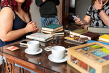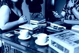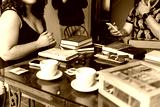 Writers meeting discussing literature and sharing ideas over coffee and cookies