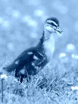 Fluffy Muscovy duckling , two week old, n the grass, exploring.