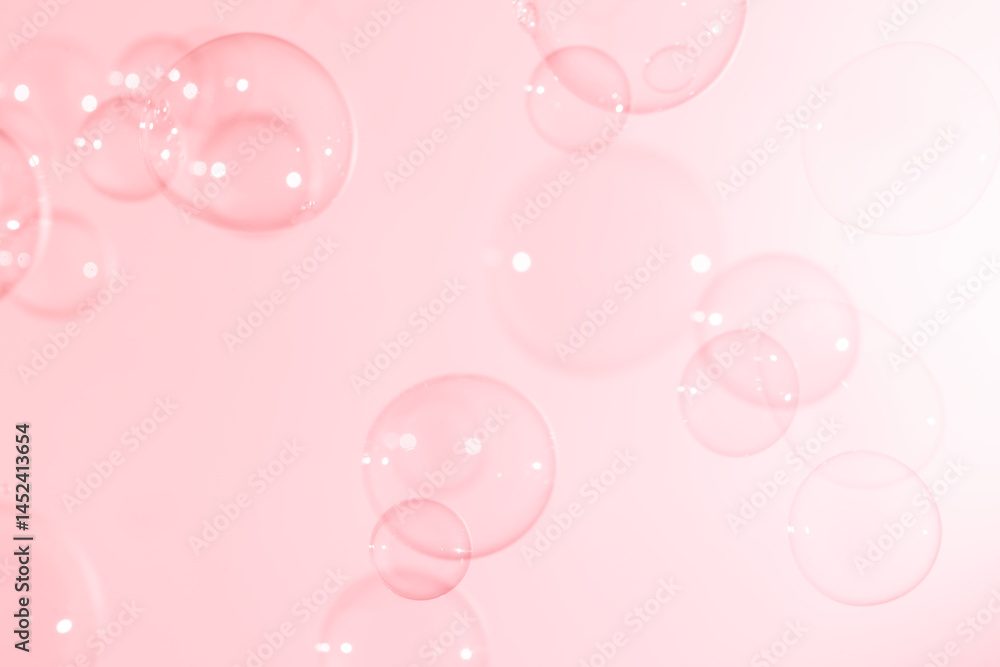 Beautiful Transparent Pink Soap Bubbles Floating in The Air. Celebration Festive Backdrop. Freshness Soap Suds Bubbles Water. Pink and White Gradient Textured.