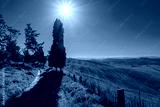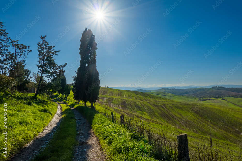Idyllic countryside landscape with a pathway between trees, surrounded by lush green fields under bright sunshine and clear skies, evoking tranquility and natural beauty.