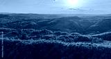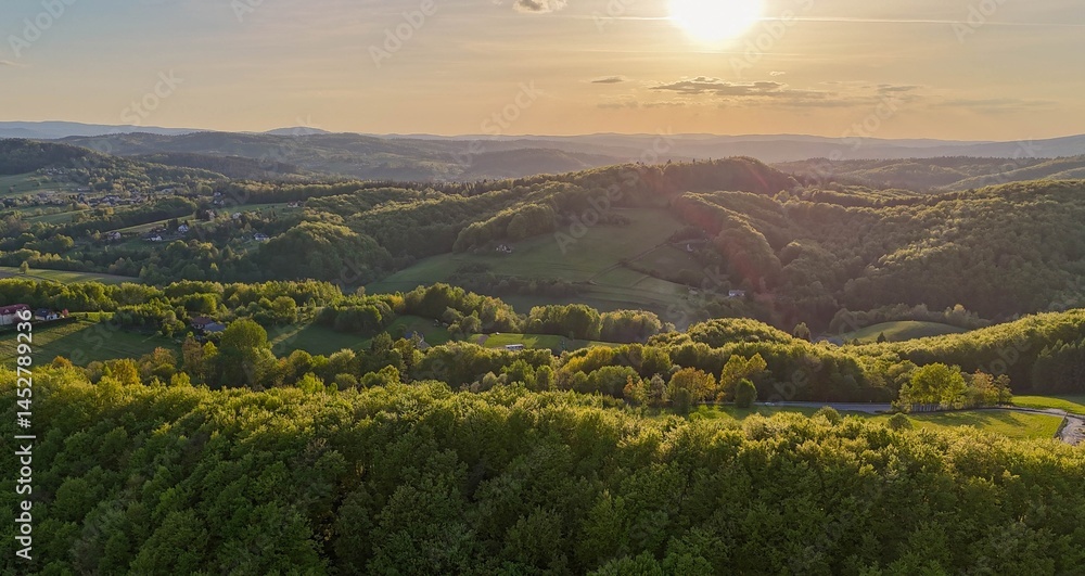 Aerial, picturesque, panoramic shot of a sunset over the green mountains of Bieszczady