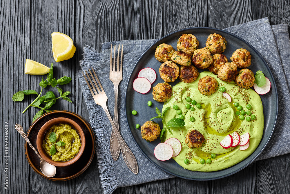 chicken broccoli meatballs with green pea hummus