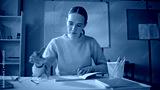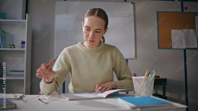 Positive girl working school at class room closeup. Woman teacher putting marks