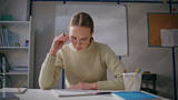 Attentive lady working school light day closeup. Woman in glasses putting marks