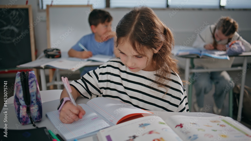 Little girl holding pen thinking in classroom closeup. Schoolgirl writing lesson