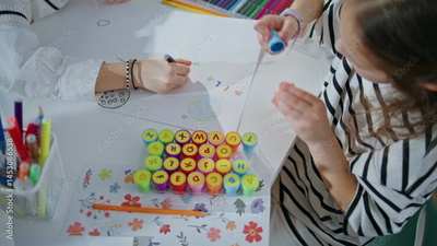 Involved kid playing stamps enjoying art lesson in school class room closeup