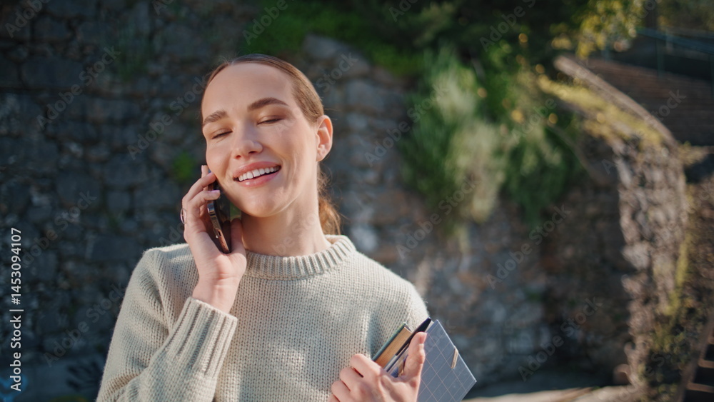 Positive lady calling mobile phone looking camera at city closeup. Girl talking