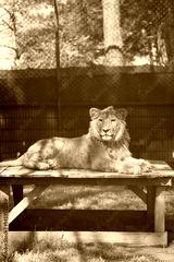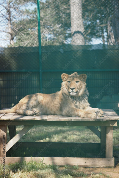 Lion resting on wooden platform in serene wildlife sanctuary