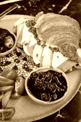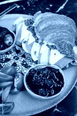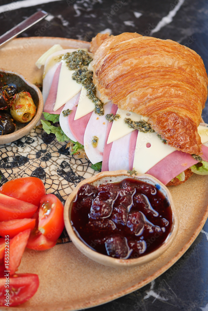 Gourmet croissant sandwich served with side of cherry jam and tomatoes