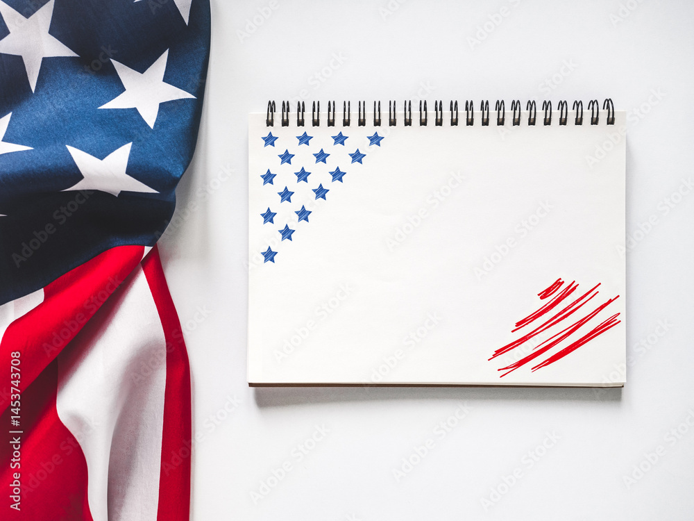 American Flag on white background and space for Your congratulatory inscription. Greeting card. Studio shot. Congratulations for family, loved ones, relatives, friends and colleagues